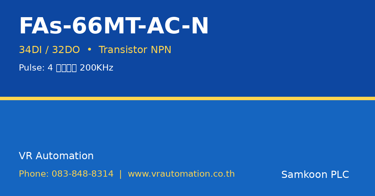 สรุปย่อ: FAs-66MT-AC-N เป็น PLC ซีรีส์ FAs จาก Samkoon (显控) ขนาดใหญ่ มี Digital I/O รวม 66 จุด (34DI/32DO) เอาต์พุตแบบ ทรานซิสเตอร์ NPN เชื่อมต่อผ่าน Ethernet (Modbus TCP) รองรับ High Speed Counter 4 ช่อง 200KHz ใช้ซอฟต์แวร์ SamSoar2022 รองรับ Ladder, FBD, SFC และ C Language