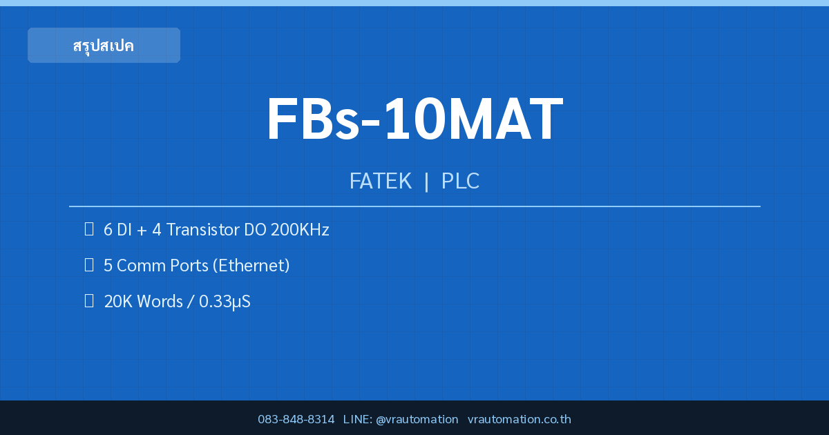 สรุปย่อ: FBs-10MAT เป็น PLC Basic MA Series จาก FATEK มี 6 Digital Input และ 4 Transistor Output รองรับ High-Speed Pulse Output 200KHz สำหรับงาน Motion Control เบื้องต้น พร้อม Communication Port ขยายได้ถึง 5 พอร์ต