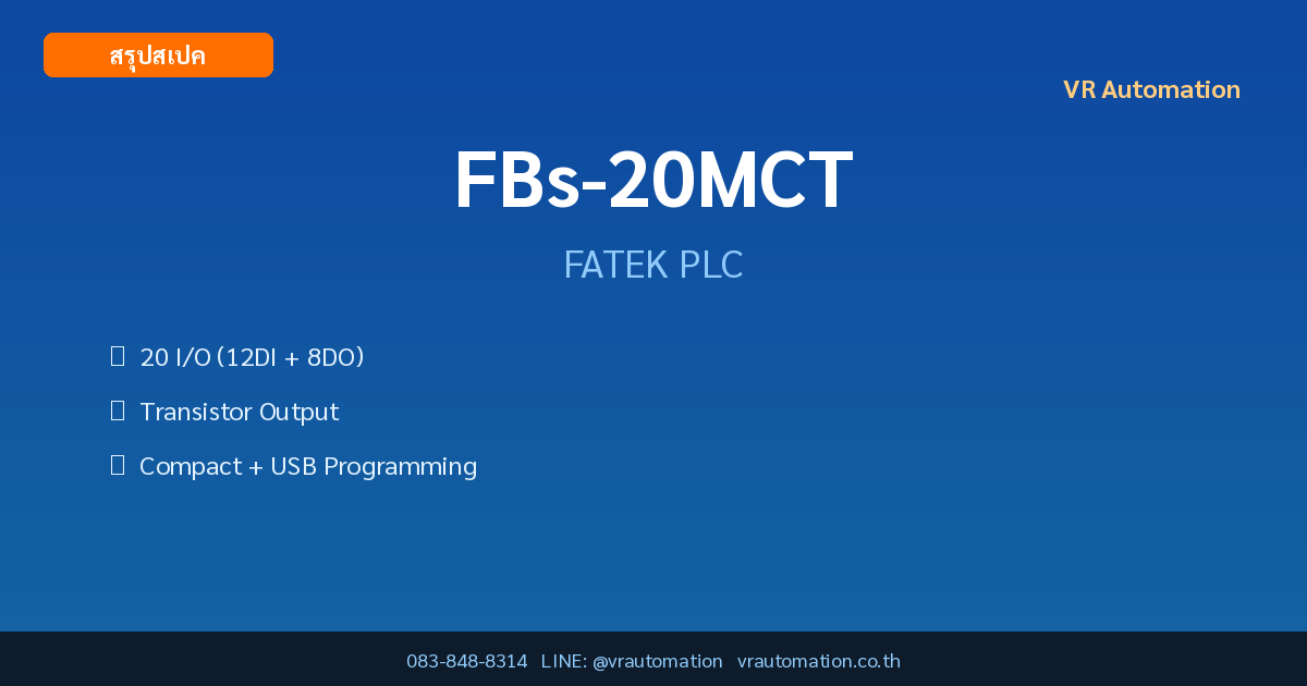 วิธีใช้งาน: FBs-20MCT เป็น PLC จาก FATEK ซีรีส์ FBs-MC Compact Series มี I/O ในตัว 20 จุด รองรับ RS232 (Port1) + RS485 (Port2) + USB เหมาะสำหรับงานควบคุมอัตโนมัติในอุตสาหกรรม จำหน่ายโดย VR Automation