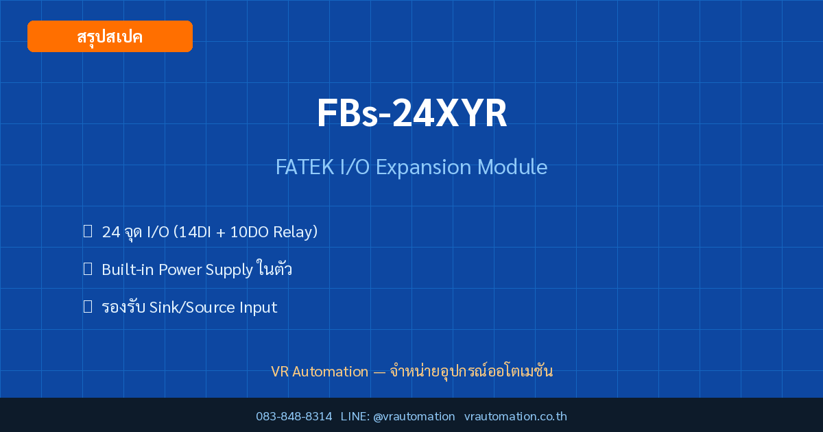 FBs-24XYR คือ I/O Expansion Module จาก FATEK ที่ออกแบบมาสำหรับงานอุตสาหกรรม โดยมีจุดเด่นหลัก ได้แก่ 24 จุด I/O (14DI + 10DO Relay), Built-in Power Supply ในตัว เหมาะสำหรับวิศวกรและช่างเทคนิคที่ต้องการอุปกรณ์คุณภาพสูงในราคาที่คุ้มค่า บทความนี้สรุปสเปคเทคนิคจากเอกสาร Catalog ของ FATEK โดยตรง