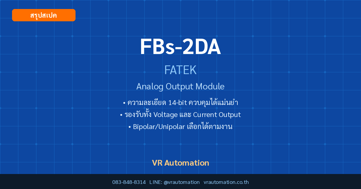 Pro Tip: FBs-2DA ใช้ Output แบบ Voltage ในการควบคุมวาล์ว Proportional หรือ VFD (0-10V) และใช้ Output แบบ Current (4-20mA) ในการควบคุมอุปกรณ์ Field Instrument ได้อย่างแม่นยำด้วยความละเอียด 14-bit