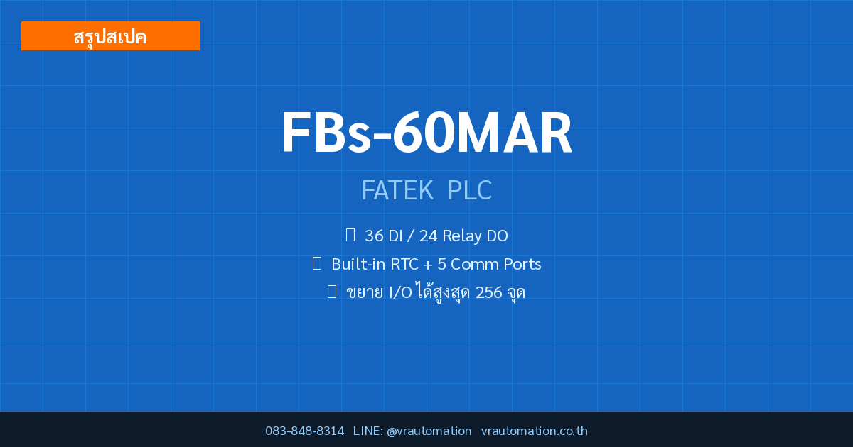 FBs-60MAR คือ PLC จาก FATEK — เหมาะสำหรับงานอุตสาหกรรมที่ต้องการความน่าเชื่อถือสูงและประสิทธิภาพการทำงานต่อเนื่อง ข้อมูลสเปคทั้งหมดในบทความนี้อ้างอิงจาก Catalog ผู้ผลิต FATEK โดยตรง