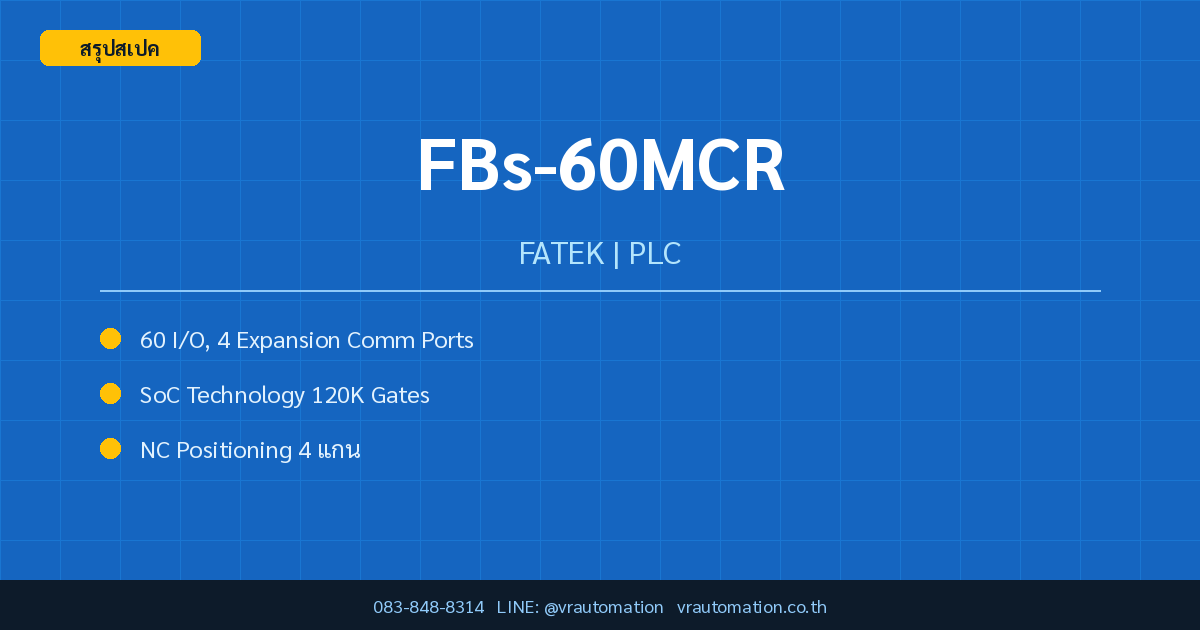 FBs-60MCR จาก FATEK เป็น PLC ใน FBs Advanced MC Series ที่ออกแบบมาสำหรับงานอุตสาหกรรม มีความเข้ากันได้กับ Mitsubishi FX3U programming environment รองรับ GX Works2/GX Developer ข้อมูลในบทความนี้สรุปจากเอกสารเทคนิคจากผู้ผลิตโดยตรง