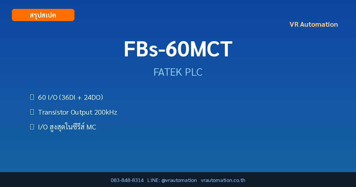 เคล็ดลับการใช้งาน: FBs-60MCT เป็น PLC จาก FATEK ซีรีส์ FBs-MC Compact Series มี I/O ในตัว 60 จุด รองรับ RS232 (Port1) + RS485 (Port2) + USB เหมาะสำหรับงานควบคุมอัตโนมัติในอุตสาหกรรม จำหน่ายโดย VR Automation