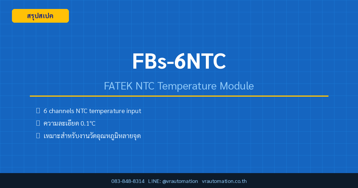 สรุปย่อ: FATEK FBs-6NTC คือ Right Side Expansion Module สำหรับวัดอุณหภูมิจาก NTC Thermistor 6 ช่องพร้อมกัน ด้วยความละเอียด 0.1°C เหมาะสำหรับงานอุตสาหกรรมที่ต้องการ monitor อุณหภูมิหลายจุดพร้อมกัน เช่น ตู้เย็นอุตสาหกรรม, HVAC, หรือระบบควบคุมความร้อน
