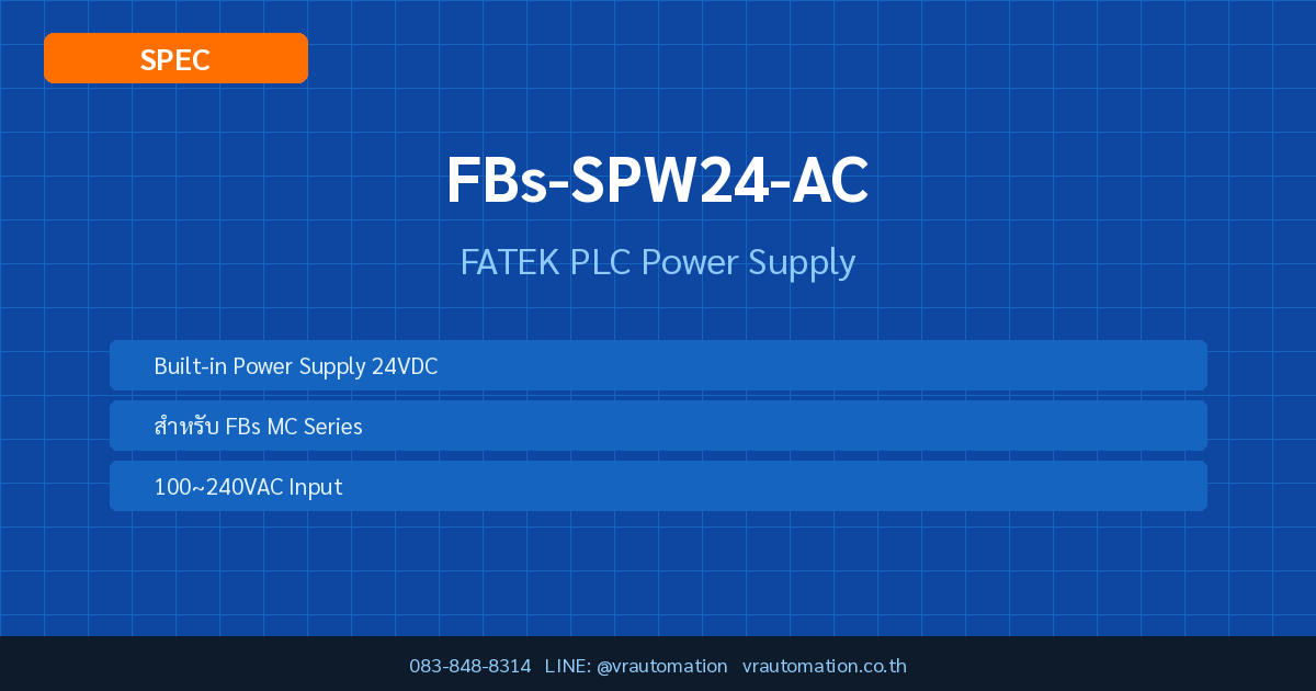 สรุปย่อ: FBs-SPW24-AC จาก FATEK เป็น PLC Power Supply ที่มีจุดเด่นด้าน Built-in Power Supply 24VDC — เหมาะสำหรับงานออโตเมชันในอุตสาหกรรม สั่งซื้อได้ที่ VR Automation โทร 083-848-8314