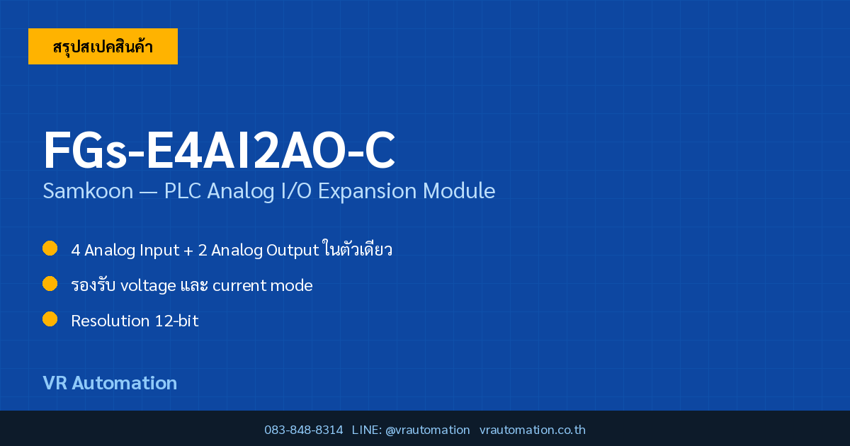 สรุปย่อ: FGs-E4AI2AO-C เป็น PLC Analog I/O Expansion Module จากแบรนด์ Samkoon ที่ได้รับความนิยมในงานอุตสาหกรรมอัตโนมัติ โดดเด่นด้วย 4 Analog Input + 2 Analog Output ในตัวเดียว และ รองรับ voltage และ current mode เหมาะสำหรับวิศวกรระบบที่ต้องการอุปกรณ์คุณภาพ ราคาคุ้มค่า พร้อมบริการหลังการขายจาก VR Automation