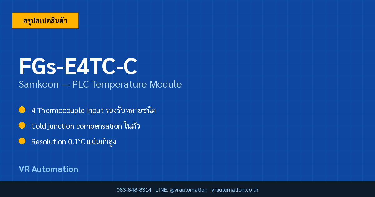 สรุปย่อ: FGs-E4TC-C เป็น PLC Temperature Module จากแบรนด์ Samkoon ที่ได้รับความนิยมในงานอุตสาหกรรมอัตโนมัติ โดดเด่นด้วย 4 Thermocouple Input รองรับหลายชนิด และ Cold junction compensation ในตัว เหมาะสำหรับวิศวกรระบบที่ต้องการอุปกรณ์คุณภาพ ราคาคุ้มค่า พร้อมบริการหลังการขายจาก VR Automation