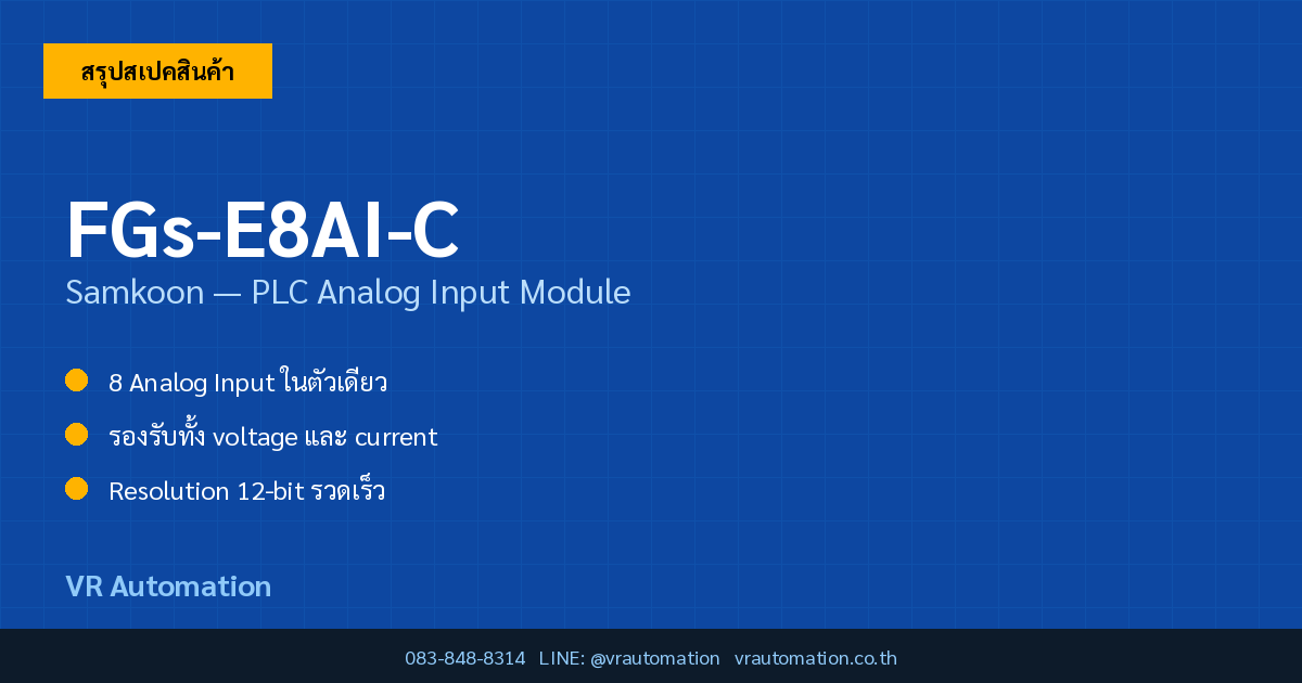 สรุปย่อ: FGs-E8AI-C เป็น PLC Analog Input Module จากแบรนด์ Samkoon ที่ได้รับความนิยมในงานอุตสาหกรรมอัตโนมัติ โดดเด่นด้วย 8 Analog Input ในตัวเดียว และ รองรับทั้ง voltage และ current เหมาะสำหรับวิศวกรระบบที่ต้องการอุปกรณ์คุณภาพ ราคาคุ้มค่า พร้อมบริการหลังการขายจาก VR Automation