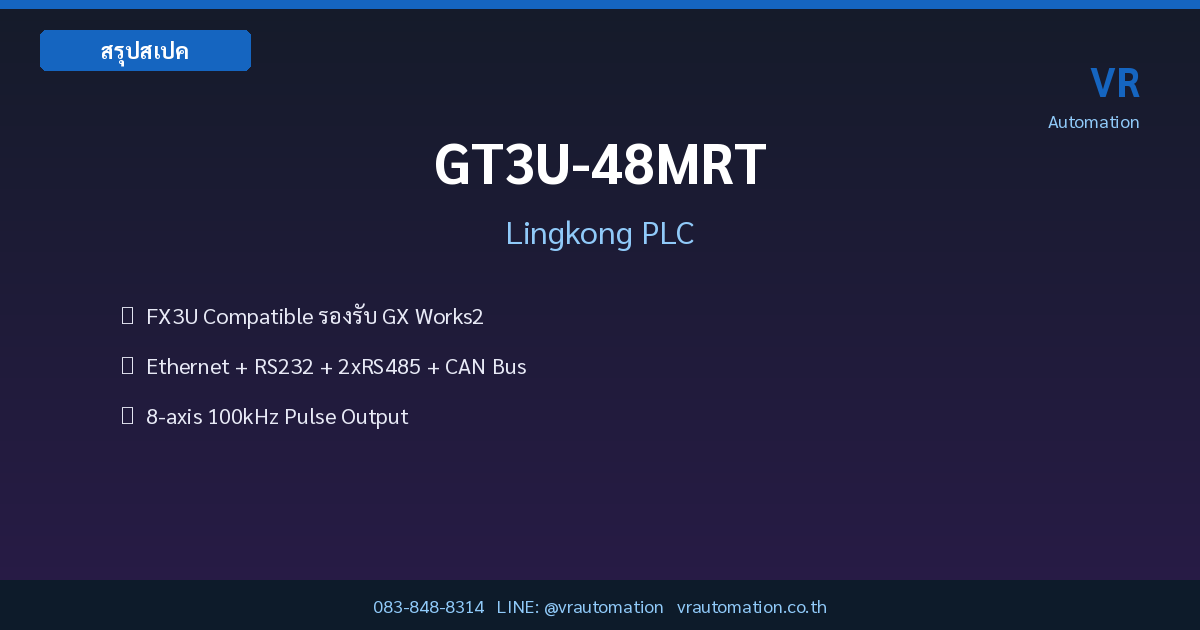 สรุปย่อ: GT3U-48MRT เป็น PLC จาก Lingkong ที่ออกแบบมาสำหรับงาน Automation ขนาดกลาง-ใหญ่ ด้วย I/O รวม 48 จุด (24 Input + 24 Output แบบ Hybrid MRT) พร้อมฟีเจอร์การสื่อสารครบครัน ทั้ง Ethernet, RS232, RS485 และ CAN Bus รองรับการเขียนโปรแกรมผ่าน GX Works2 ที่วิศวกรไทยคุ้นเคย ทำให้เปลี่ยนจาก Mitsubishi FX3U มาใช้ได้ทันทีโดยไม่ต้องเรียนรู้ใหม่