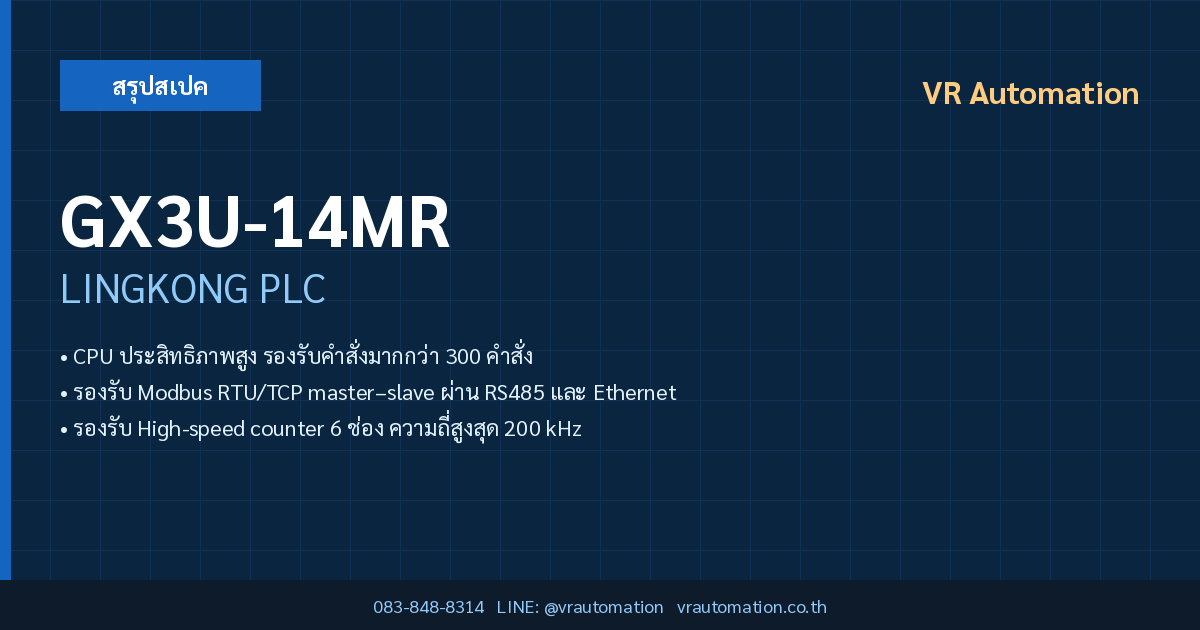 สรุปย่อ: GX3U-14MR เป็น PLC จาก LINGKONG ซีรีส์ GX3U ขนาด 8 Inputs / 6 Outputs รองรับ RS485, RS232, Ethernet เหมาะกับงานควบคุมเครื่องจักรในอุตสาหกรรมไทย มีจำหน่ายพร้อมส่งที่ VR Automation โทร 083-848-8314