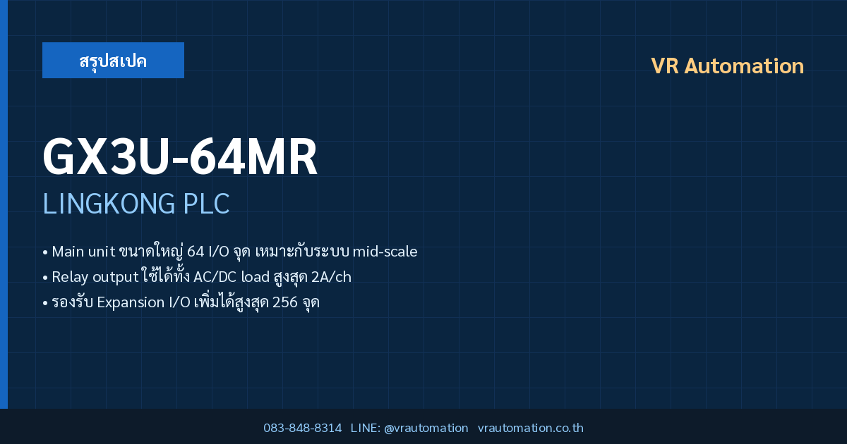 สรุปย่อ: GX3U-64MR เป็น PLC จาก LINGKONG ซีรีส์ GX3U ขนาด 32 Inputs / 32 Outputs รองรับ RS485, RS232, Ethernet เหมาะกับงานควบคุมเครื่องจักรในอุตสาหกรรมไทย มีจำหน่ายพร้อมส่งที่ VR Automation โทร 083-848-8314