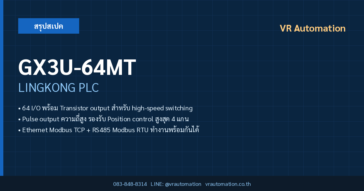 สรุปย่อ: GX3U-64MT เป็น PLC จาก LINGKONG ซีรีส์ GX3U ขนาด 32 Inputs / 32 Outputs รองรับ RS485, RS232, Ethernet เหมาะกับงานควบคุมเครื่องจักรในอุตสาหกรรมไทย มีจำหน่ายพร้อมส่งที่ VR Automation โทร 083-848-8314
