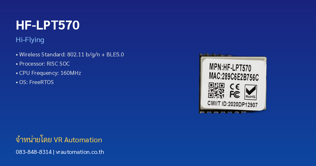 HF-LPT570 เป็น WiFi + BLE5.0 IoT Module (SMT Package) จาก Hi-Flying รองรับ 802.11 b/g/n + BLE5.0 เหมาะสำหรับงาน IoT และระบบอัตโนมัติ