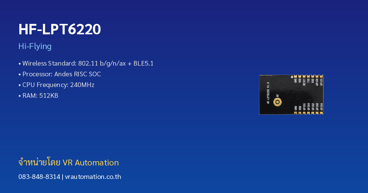 HF-LPT6220 เป็น WiFi6 + BLE5.1 IoT Module (SMT Package) จาก Hi-Flying รองรับ 802.11 b/g/n/ax + BLE5.1 เหมาะสำหรับงาน IoT และระบบอัตโนมัติ