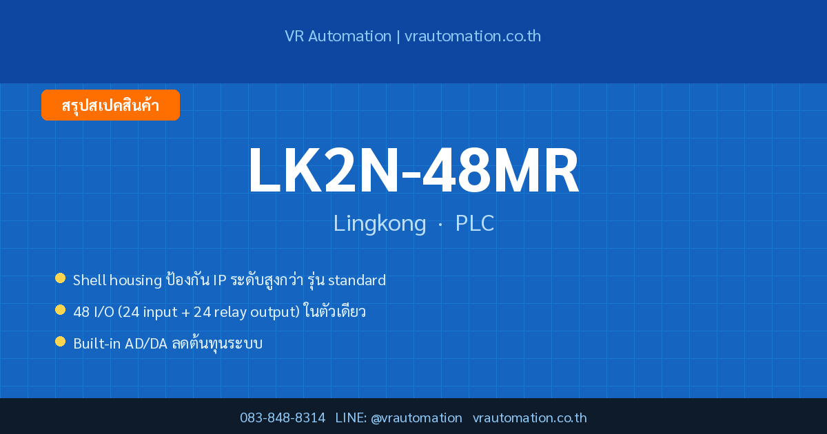 LK2N-48MR Lingkong — PLC รุ่นนี้โดดเด่นด้วย shell housing ป้องกัน ip ระดับสูงกว่า รุ่น standard พร้อม 48 i/o (24 input + 24 relay output) ในตัวเดียว เหมาะสำหรับงานระบบควบคุมที่ต้องการ housing แข็งแรง จำหน่ายโดย VR Automation พร้อมทีมวิศวกรให้คำปรึกษาตลอด