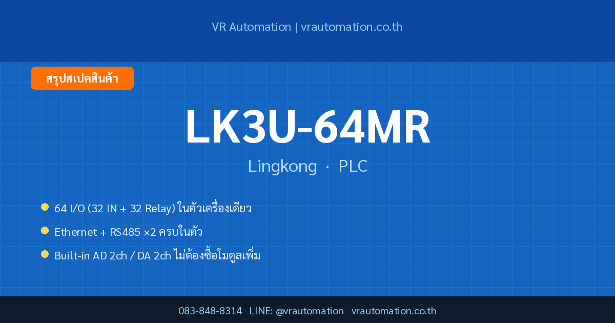 LK3U-64MR Lingkong — PLC โดดเด่นด้วย64 i/o (32 in + 32 relay) ในตัวเครื่องเดียว พร้อมethernet + rs485 ×2 ครบในตัว เหมาะสำหรับงานระบบ HVAC ในอาคารโรงงาน จำหน่ายโดย VR Automation พร้อมทีมวิศวกรให้คำปรึกษา