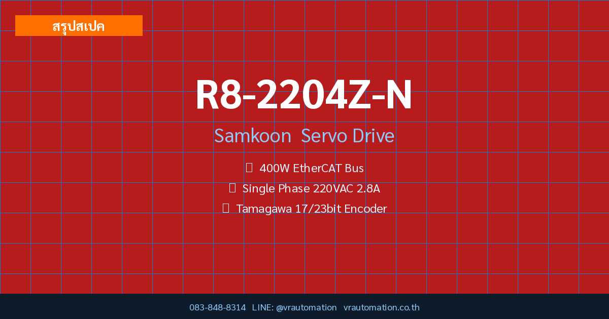 R8-2204Z-N คือ Servo Drive จาก Samkoon — เหมาะสำหรับงานอุตสาหกรรมที่ต้องการความน่าเชื่อถือสูงและประสิทธิภาพการทำงานต่อเนื่อง ข้อมูลสเปคทั้งหมดในบทความนี้อ้างอิงจาก Catalog ผู้ผลิต Samkoon โดยตรง