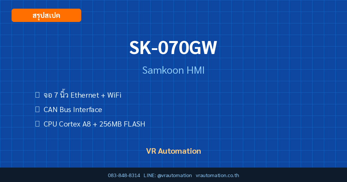 สรุปย่อ: SK-070GW จาก Samkoon เป็น HMI ที่โดดเด่นด้วย จอ 7 นิ้ว Ethernet + WiFi เหมาะสำหรับงานระบบอัตโนมัติในอุตสาหกรรม จำหน่ายโดย VR Automation พร้อมบริการหลังการขายครบวงจร