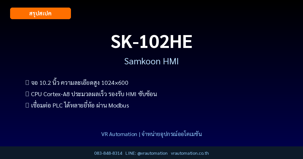 SK-102HE Samkoon HMI เป็นอุปกรณ์ระดับอุตสาหกรรมที่ได้รับความนิยมในงาน Automation ทั่วโลก บทความนี้รวบรวมสเปคเทคนิคจากเอกสารผู้ผลิตอย่างครบถ้วน เพื่อช่วยวิศวกรในการเลือกใช้งานได้อย่างถูกต้อง สั่งซื้อได้ที่ VR Automation จัดส่งทั่วประเทศไทย