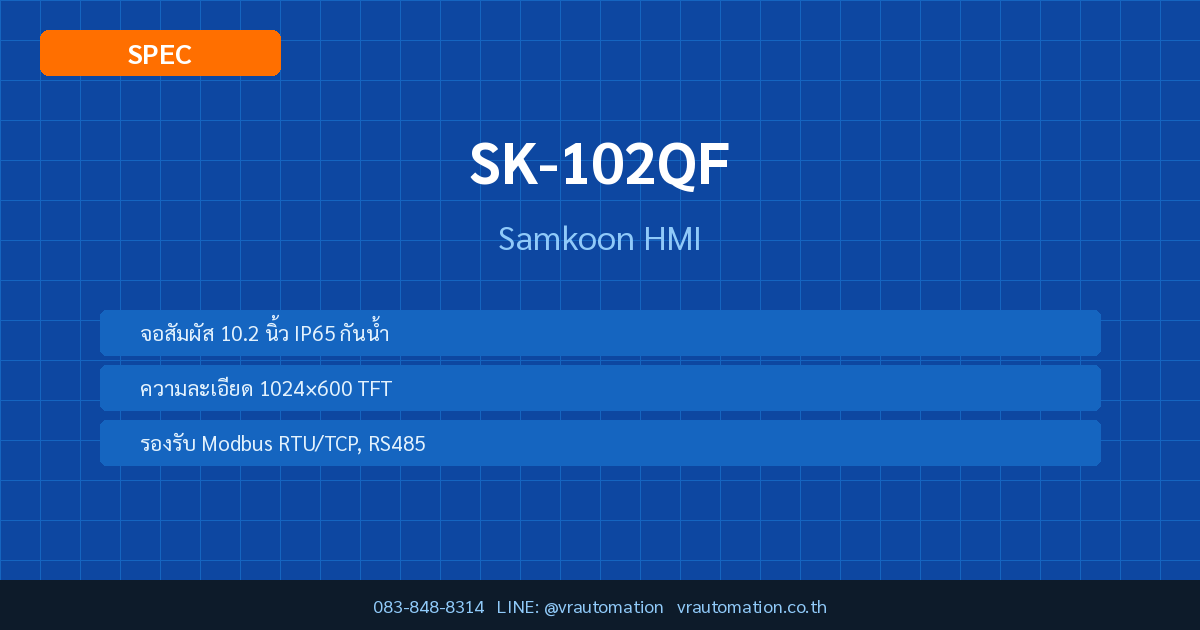 สรุปย่อ: SK-102QF จาก Samkoon เป็น HMI ที่มีจุดเด่นด้าน จอสัมผัส 10.2 นิ้ว IP65 กันน้ำ — เหมาะสำหรับงานออโตเมชันในอุตสาหกรรม สั่งซื้อได้ที่ VR Automation โทร 083-848-8314