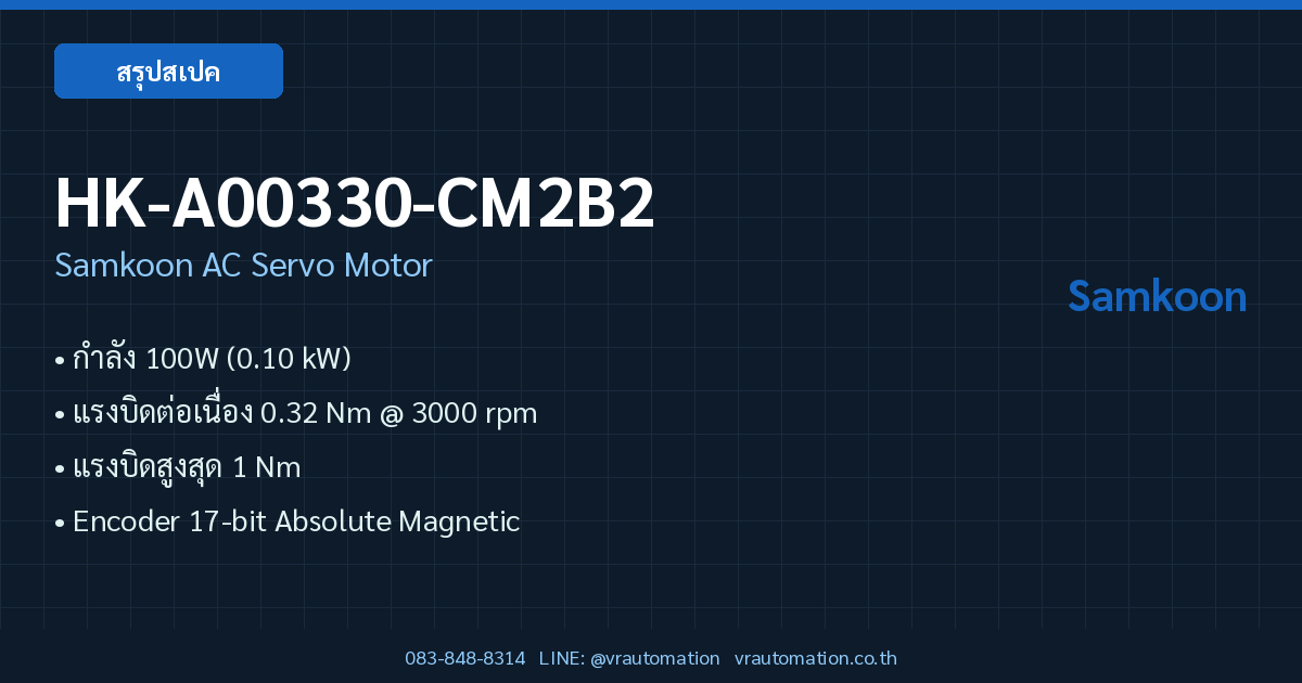 สรุปสเปค HK-A00330-CM2B2 Samkoon AC Servo Motor กำลัง 100 วัตต์ แรงบิด 0.32 Nm — ข้อมูลจากคาตาล็อกผู้ผลิตครบถ้วน พร้อมข้อมูลการสั่งซื้อ