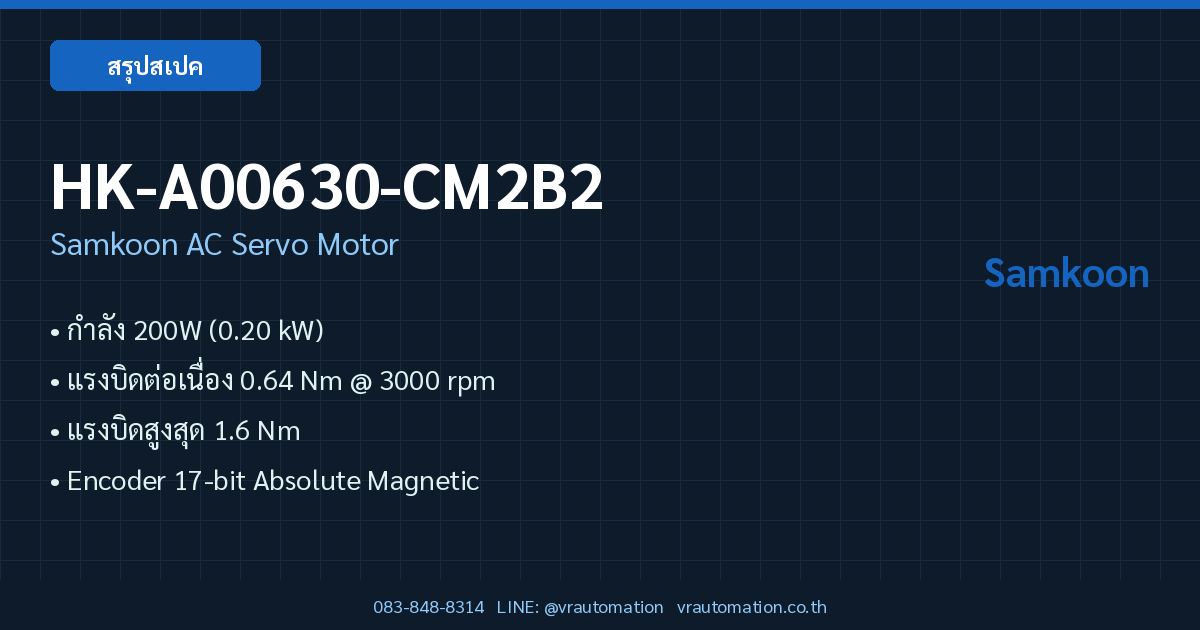 สรุปสเปค HK-A00630-CM2B2 Samkoon AC Servo Motor กำลัง 200 วัตต์ แรงบิด 0.64 Nm — ข้อมูลจากคาตาล็อกผู้ผลิตครบถ้วน พร้อมข้อมูลการสั่งซื้อ