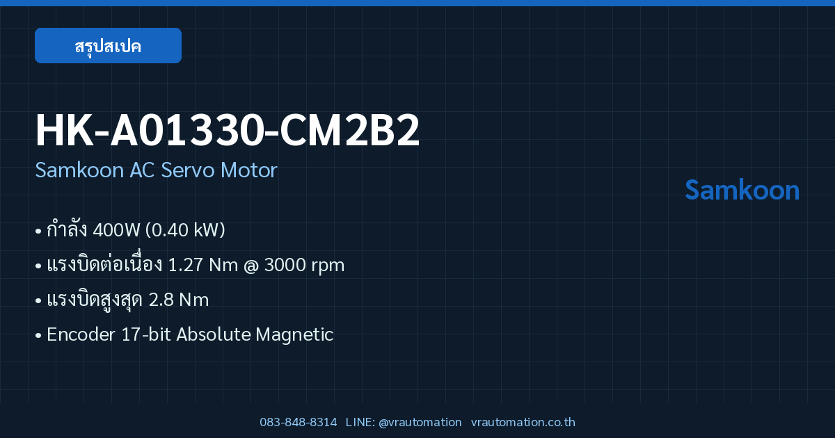 สรุปสเปค HK-A01330-CM2B2 Samkoon AC Servo Motor กำลัง 400 วัตต์ แรงบิด 1.27 Nm — ข้อมูลจากคาตาล็อกผู้ผลิตครบถ้วน พร้อมข้อมูลการสั่งซื้อ