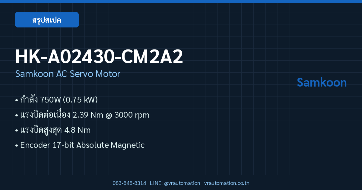สรุปสเปค HK-A02430-CM2A2 Samkoon AC Servo Motor กำลัง 750 วัตต์ แรงบิด 2.39 Nm — ข้อมูลจากคาตาล็อกผู้ผลิตครบถ้วน พร้อมข้อมูลการสั่งซื้อ