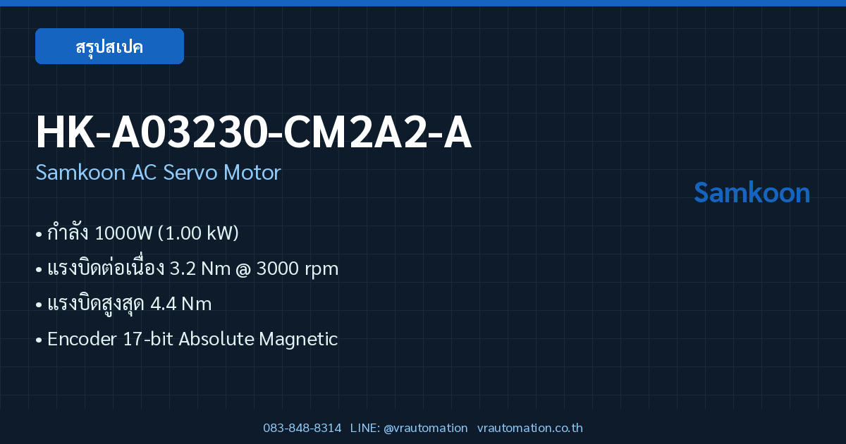 สรุปสเปค HK-A03230-CM2A2-A Samkoon AC Servo Motor กำลัง 1000 วัตต์ แรงบิด 3.2 Nm — ข้อมูลจากคาตาล็อกผู้ผลิตครบถ้วน พร้อมข้อมูลการสั่งซื้อ