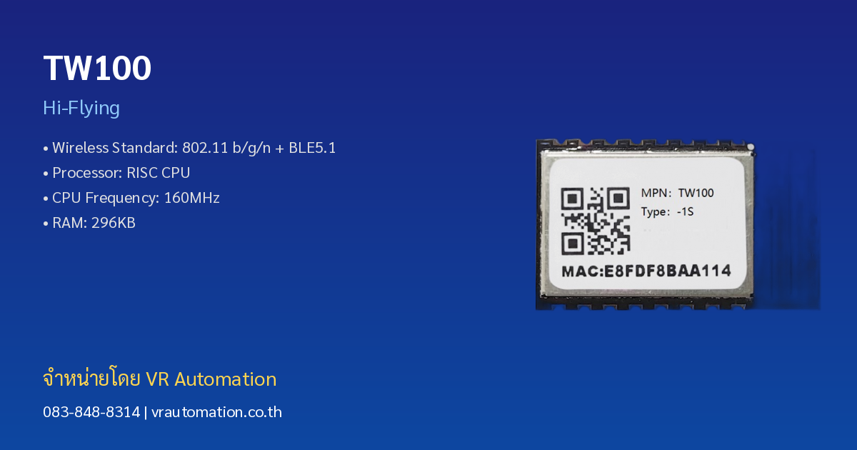 TW100 เป็น 2.4G WiFi + BLE5.1 Special IoT Module จาก Hi-Flying รองรับ 802.11 b/g/n + BLE5.1 เหมาะสำหรับงาน IoT และระบบอัตโนมัติ