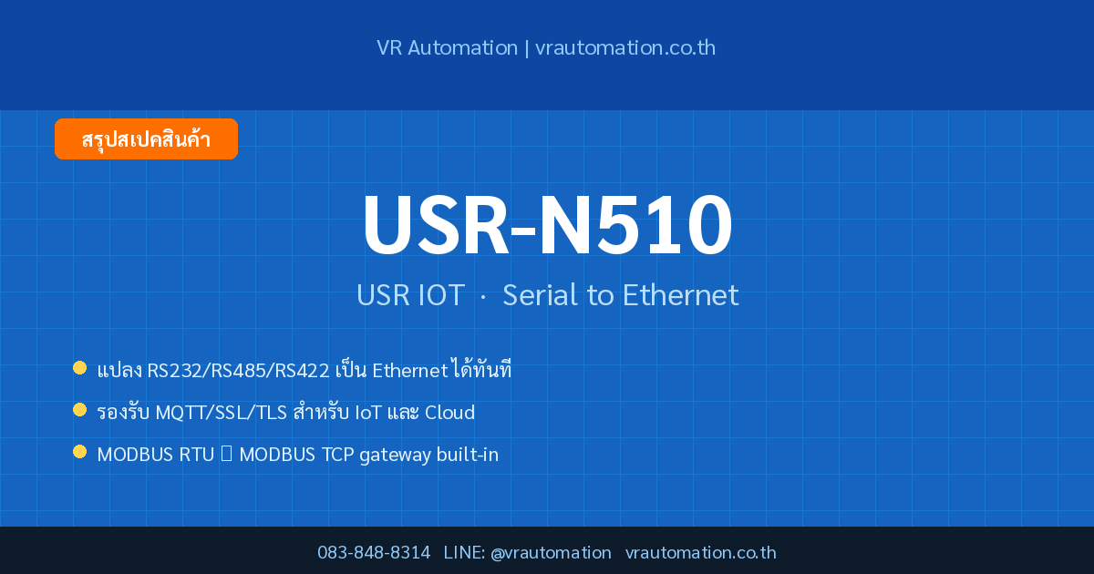 USR-N510 USR IOT — Serial to Ethernet รุ่นนี้โดดเด่นด้วย แปลง rs232/rs485/rs422 เป็น ethernet ได้ทันที พร้อม รองรับ mqtt/ssl/tls สำหรับ iot และ cloud เหมาะสำหรับงานเชื่อม PLC/Inverter เก่าเข้า SCADA ผ่าน Ethernet จำหน่ายโดย VR Automation พร้อมทีมวิศวกรให้คำปรึกษาตลอด