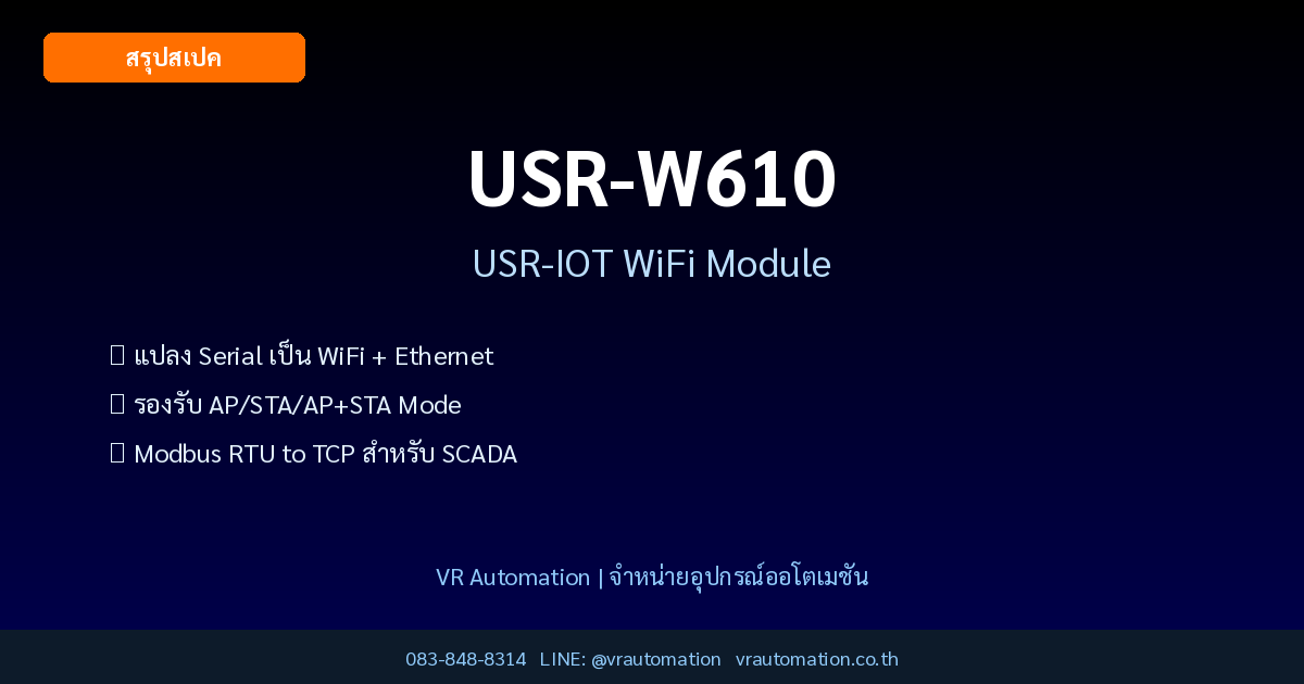 USR-W610 USR-IOT WiFi Module เป็นอุปกรณ์ระดับอุตสาหกรรมที่ได้รับความนิยมในงาน Automation ทั่วโลก บทความนี้รวบรวมสเปคเทคนิคจากเอกสารผู้ผลิตอย่างครบถ้วน เพื่อช่วยวิศวกรในการเลือกใช้งานได้อย่างถูกต้อง สั่งซื้อได้ที่ VR Automation จัดส่งทั่วประเทศไทย