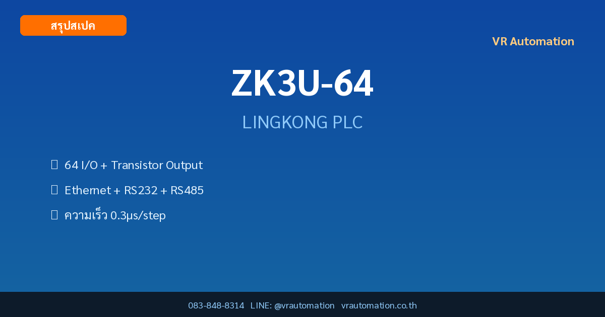 ทำไมต้องเลือก: ZK3U-64 เป็น PLC จาก LINGKONG ซีรีส์ ZK3U Series มี I/O ในตัว 64 จุด รองรับ RS232 + RS485 + Ethernet + USB เหมาะสำหรับงานควบคุมอัตโนมัติในอุตสาหกรรม จำหน่ายโดย VR Automation