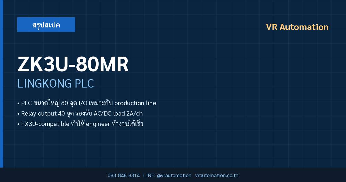 สรุปย่อ: ZK3U-80MR เป็น PLC จาก LINGKONG ซีรีส์ ZK3U ขนาด 40 Inputs / 40 Outputs รองรับ RS485, RS232 เหมาะกับงานควบคุมเครื่องจักรในอุตสาหกรรมไทย มีจำหน่ายพร้อมส่งที่ VR Automation โทร 083-848-8314